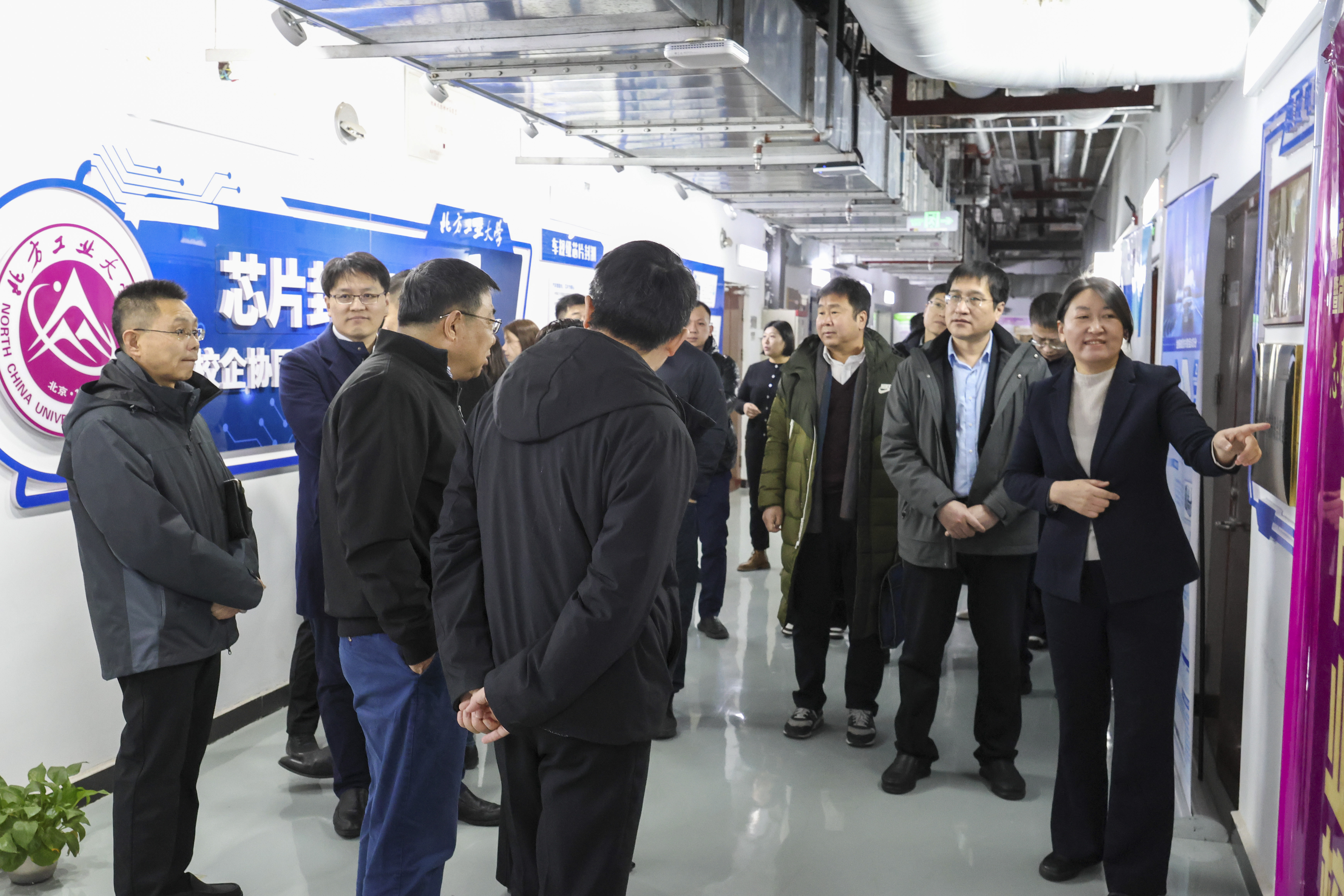 市经信局和石景山区领导首先参观了太阳成集团tyc33455超净实验室“芯片封测智能制造校企协同就业创业创新示范基地”和“集成电路工艺与测试实验室”,了解了太阳成集团tyc33455在人才培养和服务地方产业方面的举措和成效。